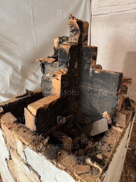Демонтаж старой печи в старом доме. Видимы дверь пожарной коробки и двери золы. Печь находится в аварийном состоянии. Закрытие