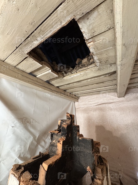 Демонтаж старой печи в старом доме. Вы можете увидеть дыру в потолке для дымохода. Печь находится в аварийном состоянии