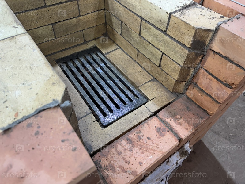 Свежая кирпичная изготовление нагревательной плиты.Огненная коробка сделана из огнеупорного кирпича, установлена решетка из чугуна.Закрыть