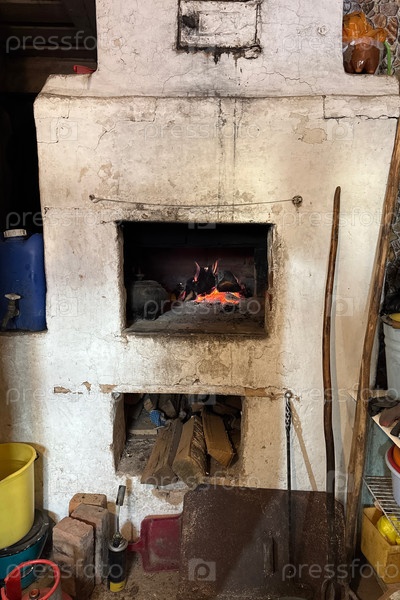 Старая русская печь. в коробке с огнём горит огонь. вы можете видеть дрова с древесиной внизу