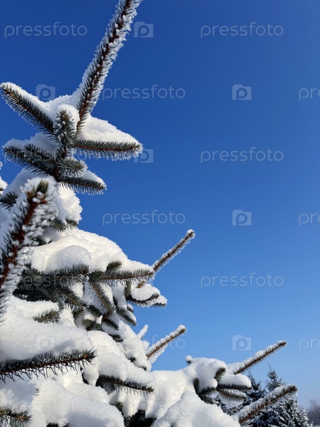 Селедка, покрытая снегом. Снежная ель ветвится вблизи голубого зимнего неба. Зимний пейзаж