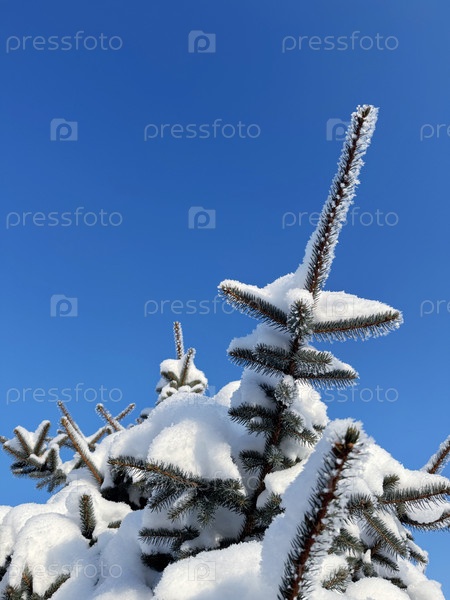 Селедка, покрытая снегом. Снежная ель ветвится вблизи голубого зимнего неба. Зимний пейзаж