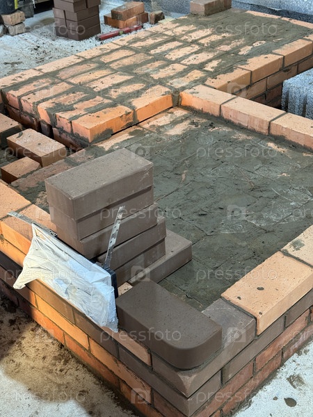 Свежая кирпичная каменная скамейка для отопления плиты и зоны коробки огня