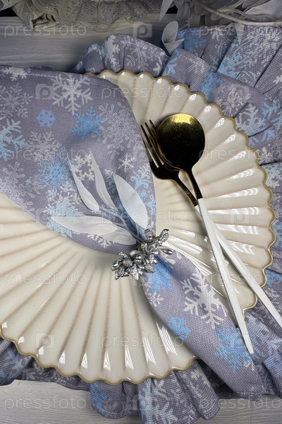 Установка стола. Столовая посуда и салфетки. Зимняя тема. Снимок сверху
