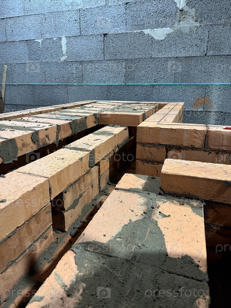 Свежие кирпичи из ямы отопительной плиты и скамейки. видны дымовые каналы скамейки. закрытие&