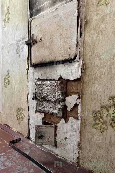 Старый обогреватель был покрыт известком, а коробка для камина, плита и печь были видны