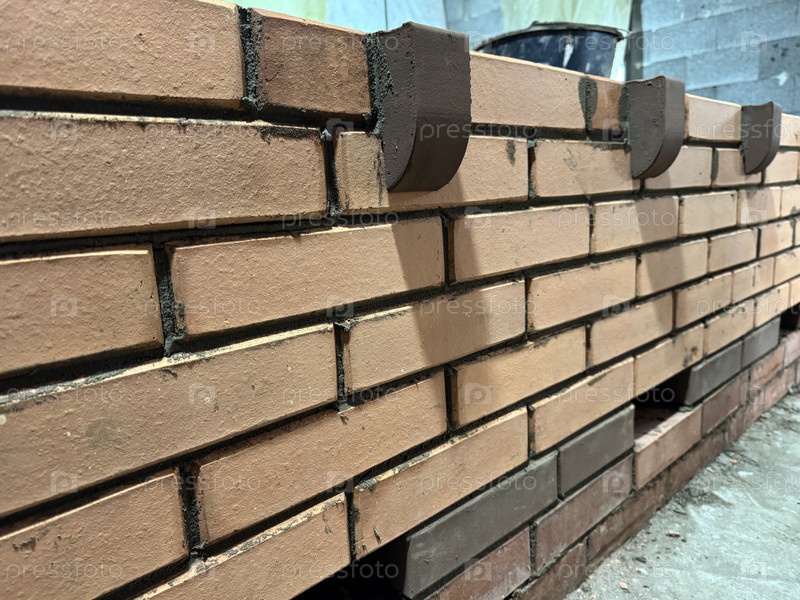 Свежая кирпичная каменная скамейка для отопления печи с декоративными элементами