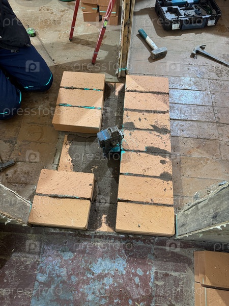 Мастер-пекарь, укладывающий кирпич для основания нагревной печи.Использование лазерного уровня