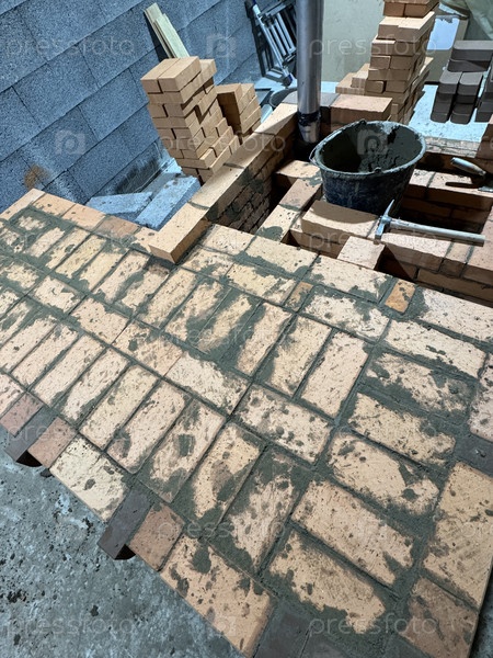 Свежие кирпичные работы отопительной плиты с скамейкой. Металлическая труба для конвекционного нагрева. Угол наклона