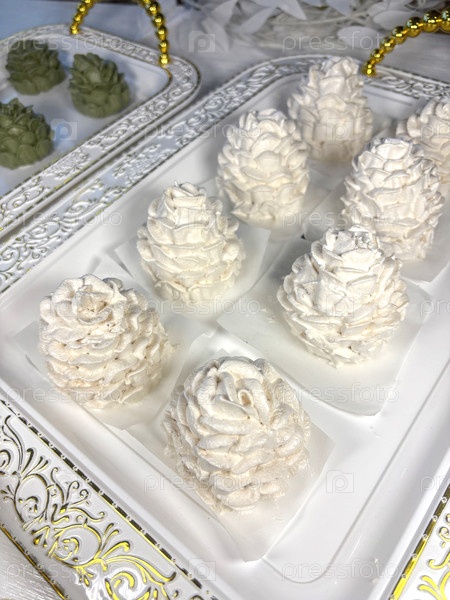 Сосновые конусы из зефира на белом подносе с серебряным узором