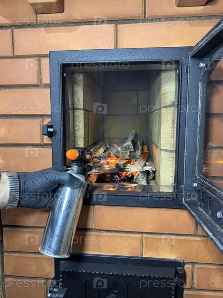 Работник зажигает испытательный огонь в коробке огня печи с помощью факела и газовой канистры