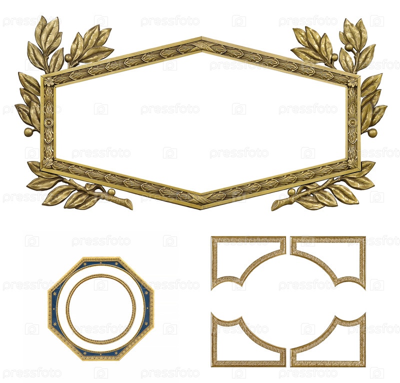 Набор золотых рамок для картин, зеркал или фотографий, изолированных на белом фоне