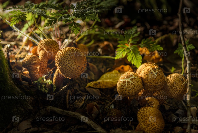 Сложные коричневые грибы - королевская пена или чешуйчатая золотая, растущие в лесистых районах