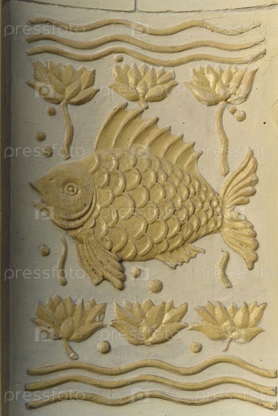 Барельефная скульптура рыбы, окруженной цветами лотоса