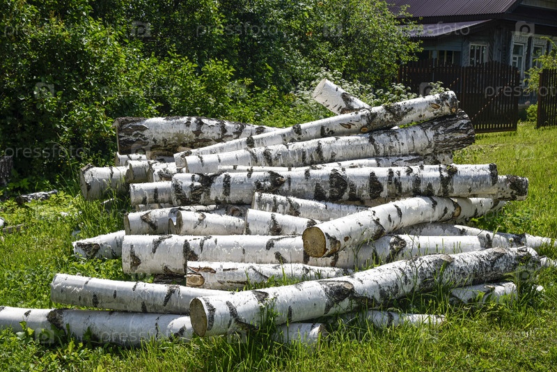 Тщательно сложенные бревенчатые бревна на зеленой траве возле деревенского дома
