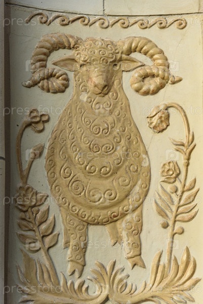 Замысловатый декоративный барельеф Барана, окруженный цветочными мотивами