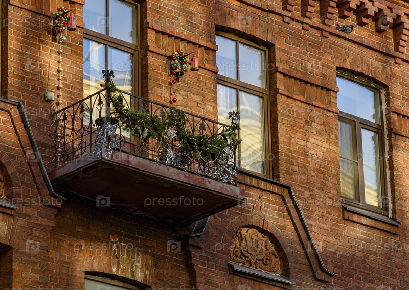 Празднично украшенный балкон с рождественскими декорациями на кирпичном здании