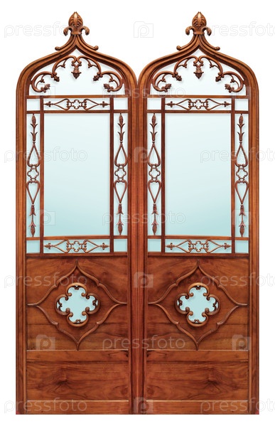 Модель входной готической деревянной двери изолирована на белом фоне