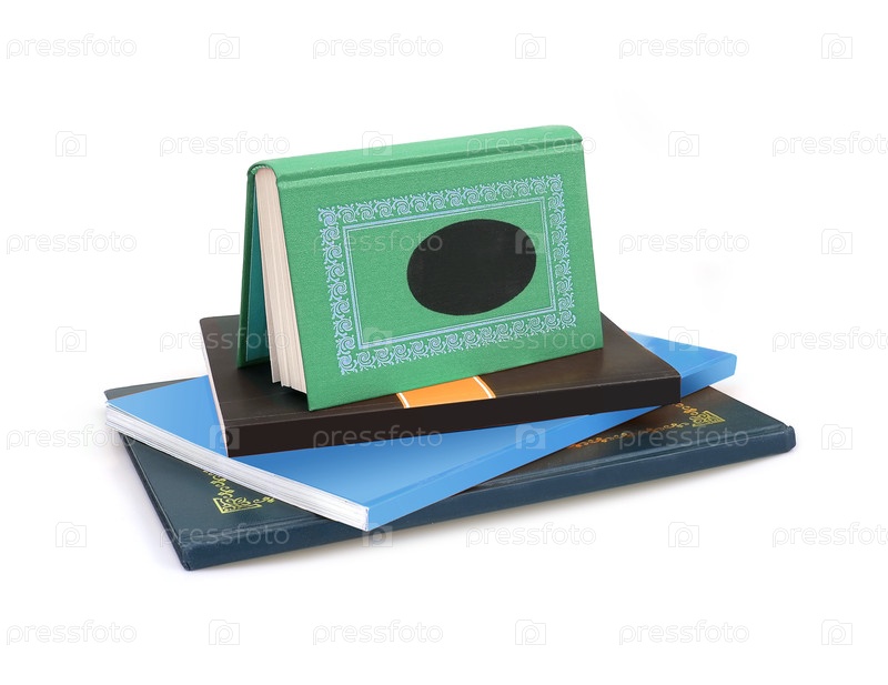 Куча книг в цветных обложках с белыми листами, изолированными на белом фоне