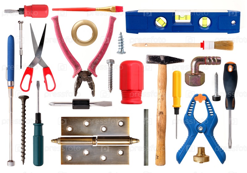 Изолированные ручные инструменты для ремонта и установки: старые клеи (композиция на белом фоне)