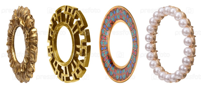 Набор золотых рамок для картин, зеркал или фотографий в фронтальной и перспективной форме, изолированных на белом фоне