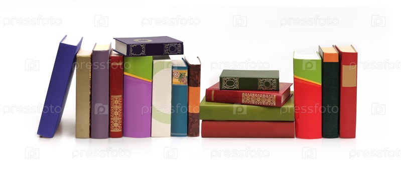 Куча книг в цветных обложках с белыми листами, изолированными на белом фоне
