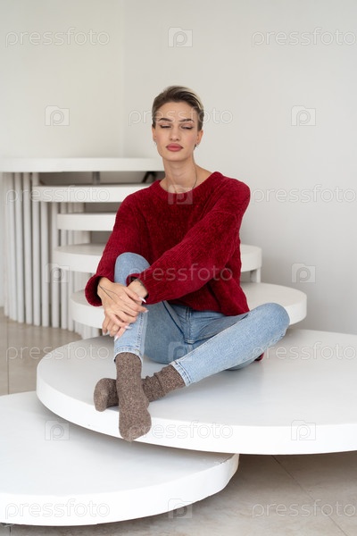 Красивая молодая женщина позирует в красном свитере в студии
