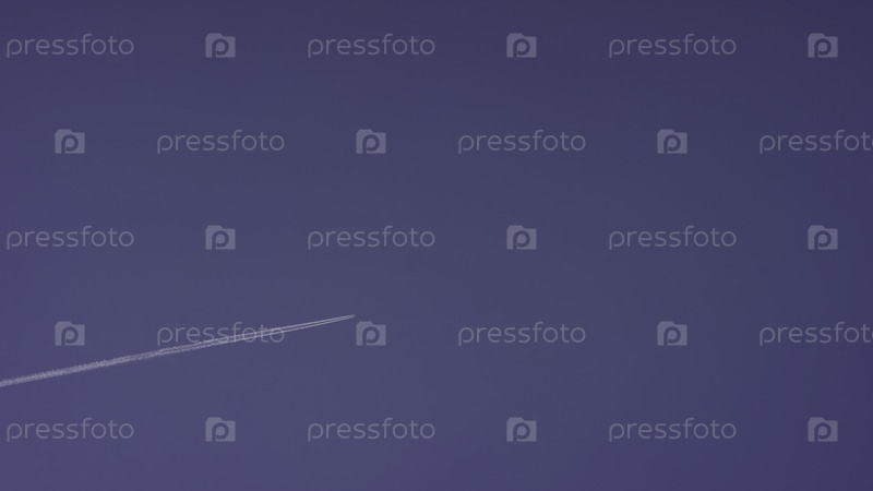 Большой пассажирский сверхзвуковой самолет летит высоко по чистому голубому небу, оставляя длинный белый след. Самолёт летает в белых облаках на синем небе