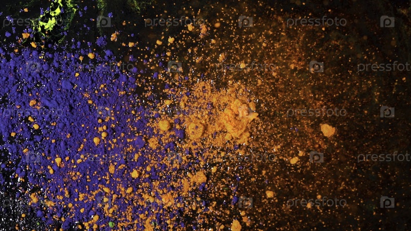 Взрыв ярко окрашенной пыли на чёрном фоне, художественная концепция.Движение синего и оранжевого порошковых чернил, красочная, яркая текстура