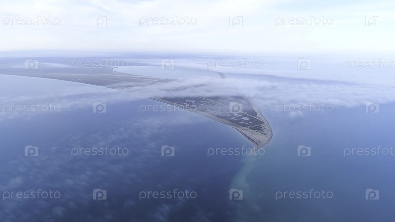 Вид на побережье среди моря против небесного горизонта. стрельба. самый высокий вид в небе среди облаков на голубом море и треугольный берег