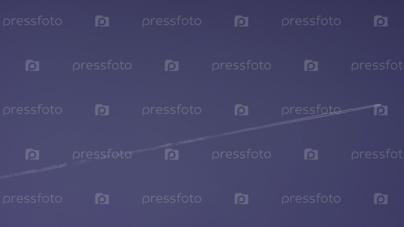 Большой пассажирский сверхзвуковой самолет летит высоко на ясном голубом небе, оставляя длинный белый след. Самолёт летает в белых облаках на синем небе. Самолёт летит в 4K синего неба