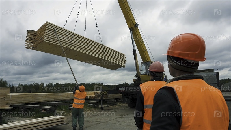 Работники, перевозящие деревянные бруски с помощью крана. Рабочий на строительной площадке, несущий деревянные бруски с помощью крана. Рабочие используют деревянную лестницу на стройплощадке. Приклеивание деревянных брусков