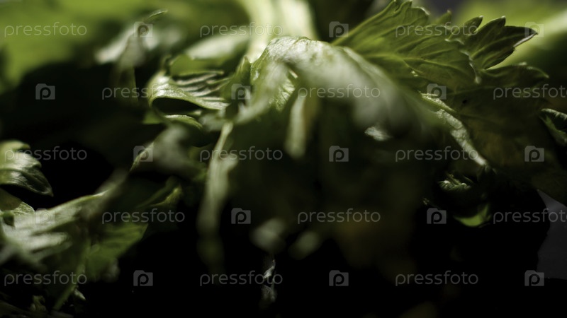 Закройте лежащие на черном столе листья кориандра, подробности процесса приготовления пищи. резервные кадры. кусок ярко-зеленой кориандерной травы