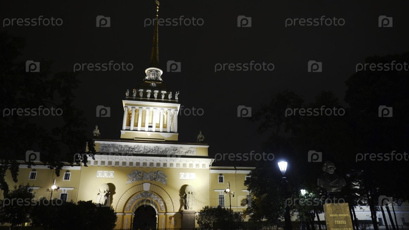 Историческое здание с башней и освещением ночью. Идите вперед. Старое здание, которое является памятником архитектуры и популярной достопримечательностью России. Здание Адмиралтейства с башней