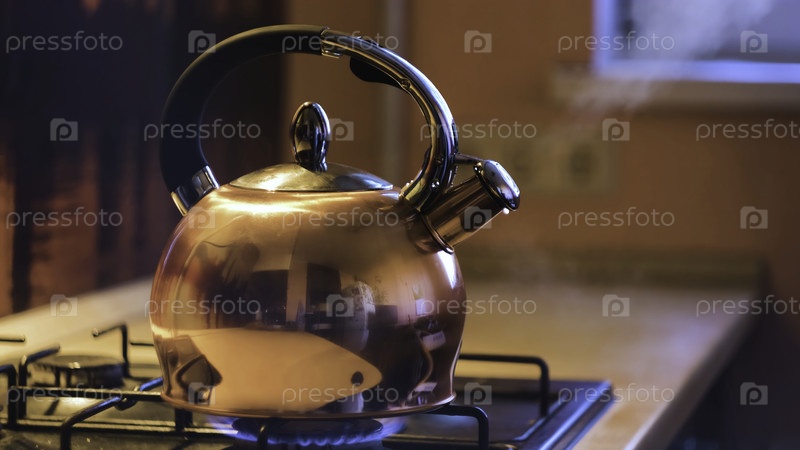 Серебряный чайник, кипящий на плите.Концепция.Кипящий чайник на печи в красивом интерьере вечерней кухни.Из чайника на пече вытекает поток пара