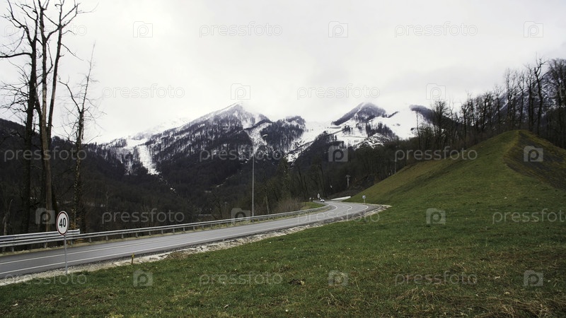 Одинокий автомобиль на горной дороге поворачивается к заснеженным вершинам и облачному тяжелому небу
