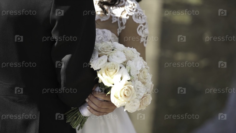Элегантные невеста и жених позируют вместе на улице в день свадьбы.Невеста держит букет белых роз, стоя рядом со женихом.Возлюбленная в платье стоит в зеленом саду и держит брачный букет цветов и зелени