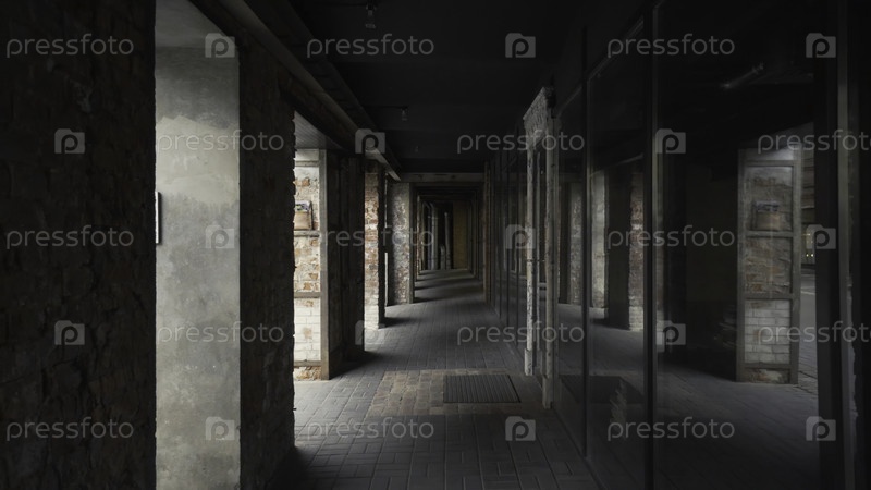 Красивая архитектура современного офисного здания с длинным коридором из кирпичных стен и зеркальных дверей
