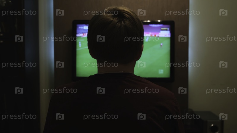 Сзади мужчина, сидящий на диване дома и смотрящий футбол поздно вечером