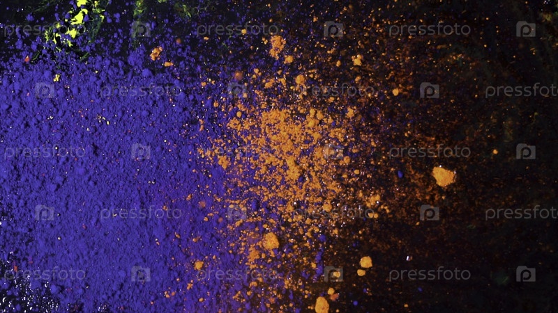 Взрыв ярко окрашенной пыли на чёрном фоне, художественная концепция.Движение синего и оранжевого порошковых чернил, красочная, яркая текстура