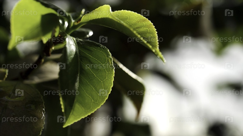 Закройте лист и капли воды на его фоне.Капли воды на зеленом листе