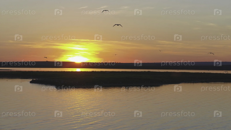 Стадо птиц против красочного неба.Закат на реке.Остров чайки.Птицы летают при закате, из воздуха