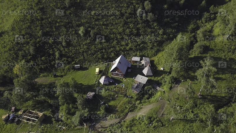 Вид с воздуха небольшой деревушки в горах, лесный фон. Красивый горный пейзаж с деревней, вид сверху. клип