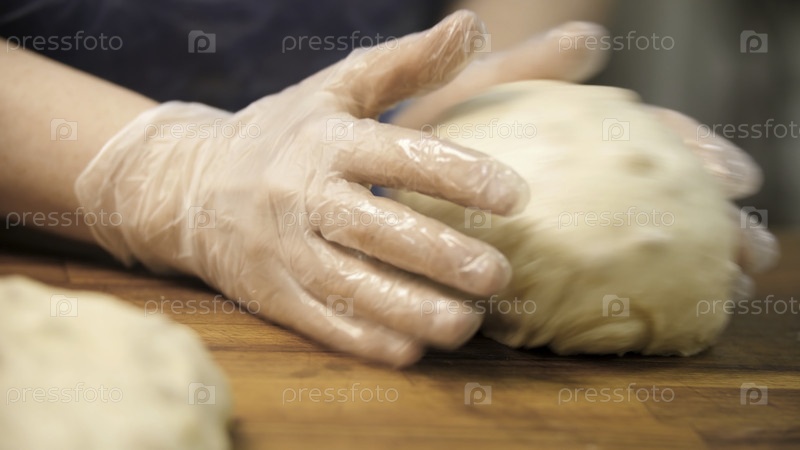 Женщина в кулинарных перчатках плетёт тесто на деревянной доске, концепция приготовления пищи. резервные кадры. рядом с руками делают печенье для выпечки хлеба
