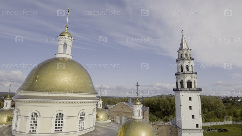 Золотые купола яркого храма с колокольницей выделяются на фоне летнего города