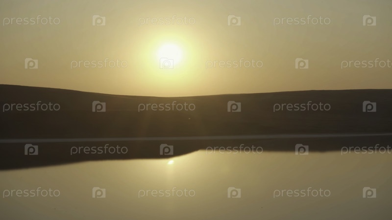 Вид с воздуха восходящего солнца на горизонте над холмом над спокойным океаном или морем