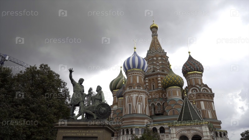 Москва, Россия - сентябрь 2019: Красная площадь с собором Святого Василия на облачном небе. Идите вперед. Прекрасная и яркая архитектура Московского Кремля с башней и храмом