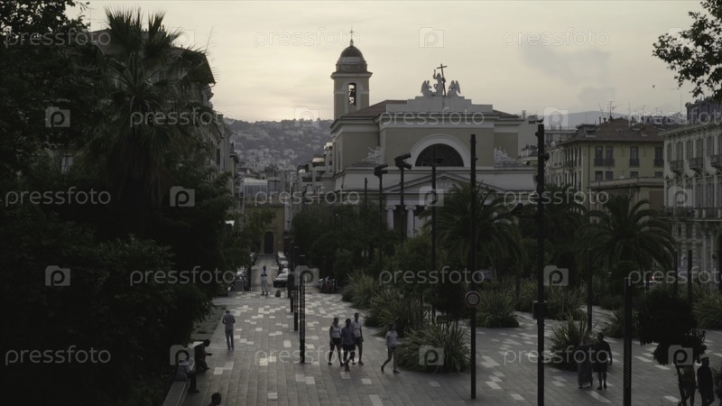 Церковь перед парком с пальмами. Идите дальше. Городской небольшой парк с пальмами и гуляющими людьми с видом на церковь. Южноевропейский город с туристами, ходящими в парке
