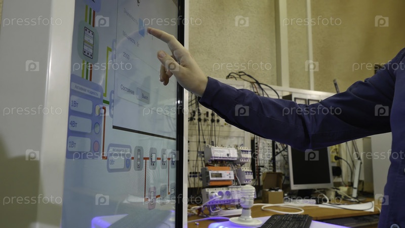 Молодой ученый использует большой сенсорный экран для работы