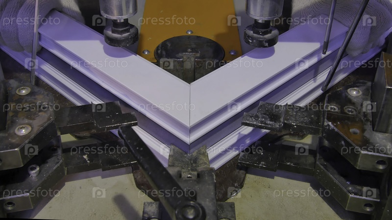 Рабочий делает окно из пластика. Промышленная пресса с знаком опасности закрыта. Работник делает окно из пластика. Производство пластиковых окон и дверей. Эпическая рама. индустрия